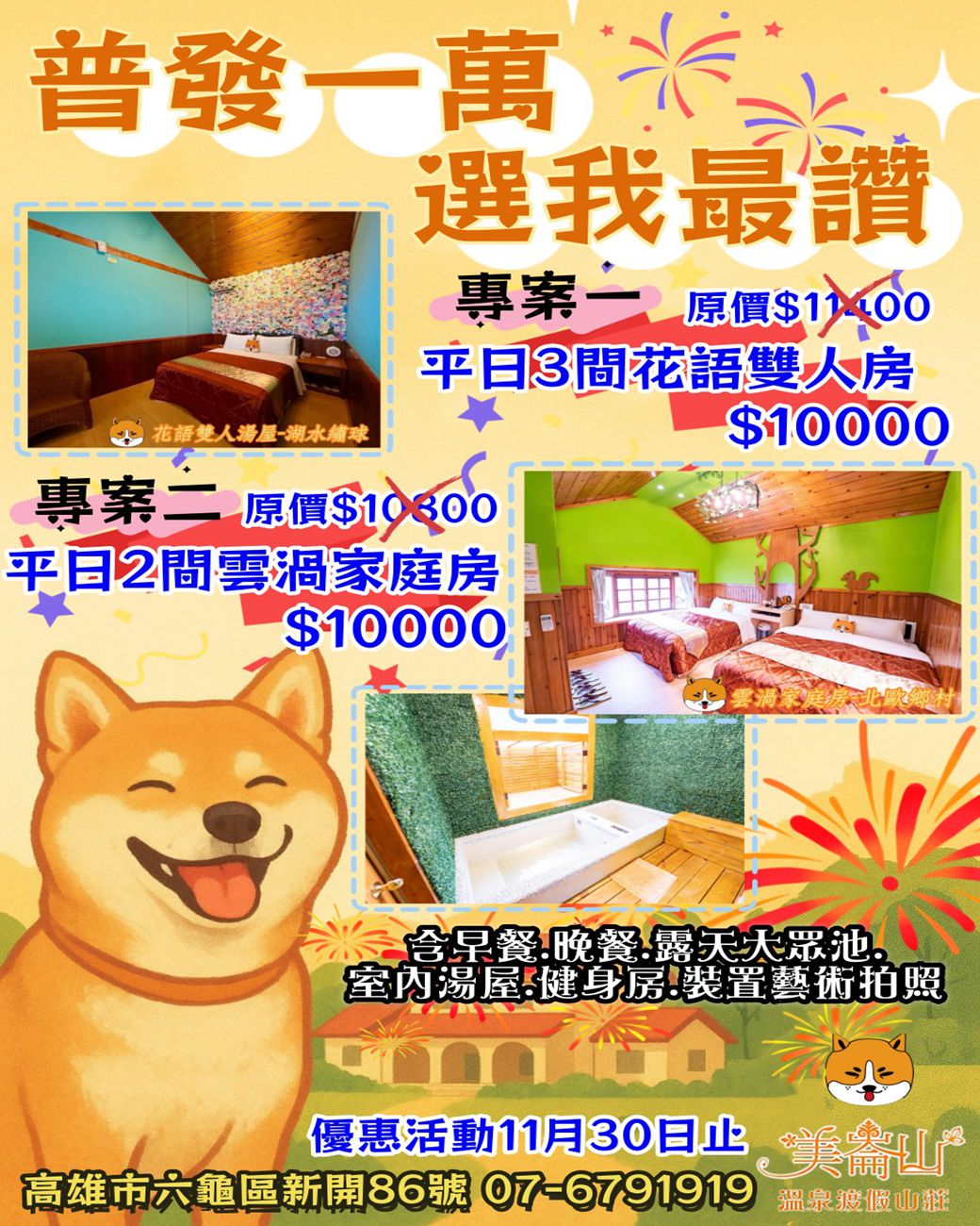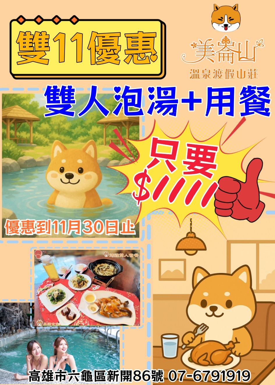 雙11限定 只要1111元 普發一萬元來囉~ 10/24~10/26光復國民泡湯日 ~快閃活動 休息湯屋+套餐餐點送現金優惠劵 美崙山線上旅展優惠開跑啦!!! 年月票優惠&會員升級2.0💯會員優惠 壽星我最大!生日來住宿,直接現省$500 六龜《仲夏夜之夢》套裝行程 2018.10.15 高雄市政府觀光局認證的溫泉標章 2018.11.22 歡慶榮獲十大名湯美食銀獎 2018.11.10 不老溫泉公車開跑拉~ 2025.03.02 員工旅遊方案 2025.01.28 2025新春營業時間 2025.01.04 即日起不提供一次性備品 一起愛地球 2025.09.27 美崙山包棟優惠方案 2020.03.26 部落客"丁小羽"推薦 2019.11.20 綜藝玩很大來美崙山溫泉囉 2019.03.15 部落客推薦